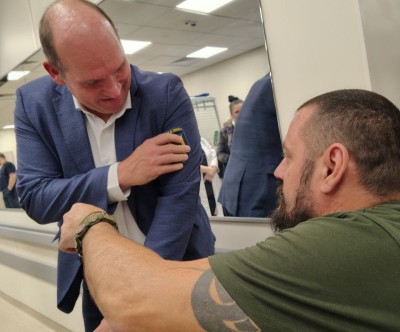 Гості подивилися, як на сучасному устаткуванні військовослужбовці проходять реабілітацію після поранень. Один із пацієнтів — військовий, який нині перебуває на відновленні, — подарував меру Брюсселя свій бойовий шеврон як знак вдячності за підтримку України.